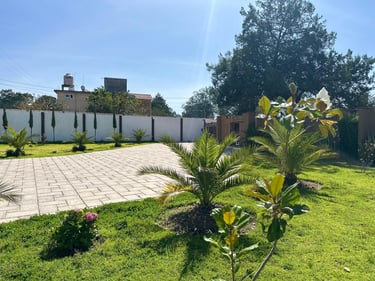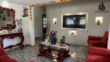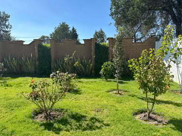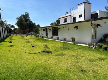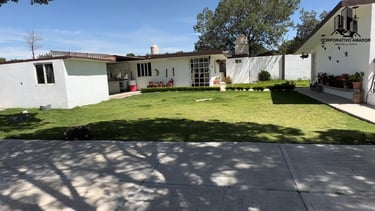 Jardín y áreas exteriores: Amplio jardín con sistema de aspersores, plaza de eventos de cemento, balcones en 2 recámaras, área libre para futuras construcciones